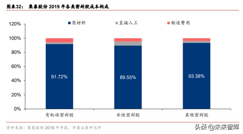 密封胶成本构成中原材料占比高达 90%,受上游石化行业影响大。根据集泰股份 2019 年 年报,公司有机硅/水性/其他密封胶成本构成中,原材料占比最高,分别为 91.7%/ 89.6%/ 93.4%。依据不同产品的类型,密封胶原材料主要为硅橡胶、合成橡胶、聚氨酯等,为石 化产品或衍生品,各种颜填料和助剂如钛白粉、高岭土、碳酸钙等则属于矿物化工产品, 石化与化工行业价格透明,其波动向终端产品的传导顺畅。