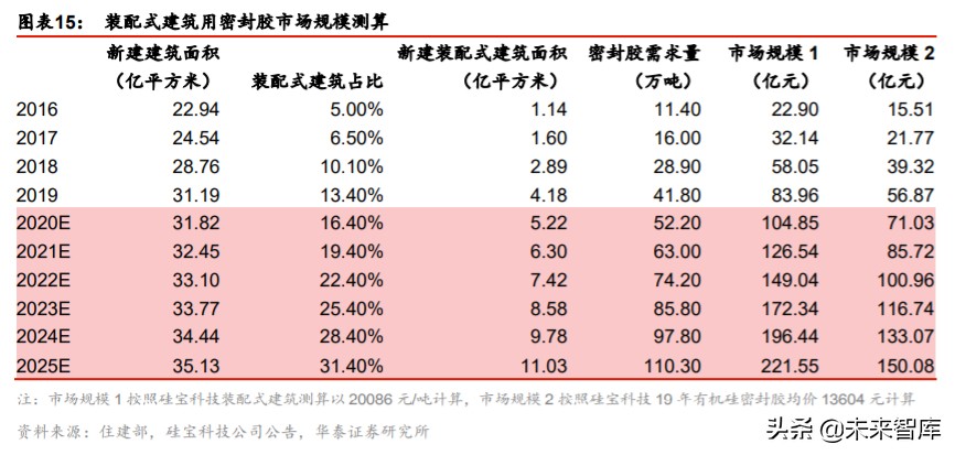 装配式建筑预制件接缝众多,带动密封胶需求提升,我们预计 2025 年有望催生 150-222 亿元新增密封胶市场。根据硅宝科技公告和集泰股份调研,装配式建筑密封胶用量是目前 门窗传统胶用量的两倍左右,每平方米建筑面积用胶需求约为 1kg。若 2020 年装配式建 筑面积达到 5.2 亿平米,我们预计将带动密封胶需求量约 52 万吨,市场规模 71-105 亿元, 根据上文测算,若 2025 年新建装配式建筑面积达 11 亿平米,装配式建筑密封胶市场将达 150-222 亿元,20-25 年 CAGR+17.6%,有望成为建筑密封胶下游需求增长最快的细分市 场。