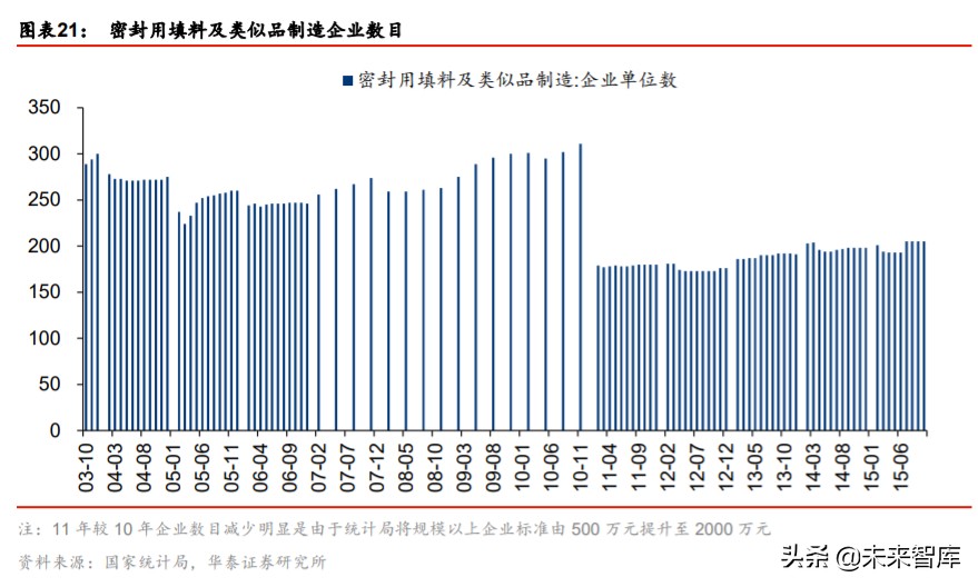 密封胶大行业小公司特征明显,行业集中度仍有待提升。我国密封胶行业中国内企业集中 度较低,低端市场竞争充分,中小型企业数量多。根据国家统计局数据,2011-2015 年全 国规模以上密封用填料及类似品制造业企业数量维持在 180-200 家。