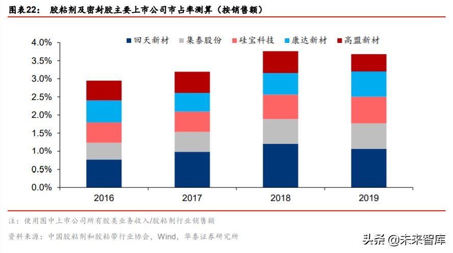环保要求及成本上升加快行业优胜劣汰,行业走向规范和集中。密封胶行业政策主要聚焦 于行业环保转型、新型密封胶开发及在电子等高科技领域的应用等,根据中国胶粘剂和胶 粘带行业发布的行业“十三五”发展规划,要坚决淘汰部分落后产能、有害物质含量和 Voc 排放不达标的产品,限制溶剂型氯丁橡胶类、丁苯热性橡胶类、聚氨酯类和丙烯酸酯 类等通用型胶粘剂生产装置的新建、改扩建,鼓励发展无溶剂型胶粘剂、水基型胶粘剂、 新型热熔胶以及其他环保节能型胶粘剂产品,企业的研发成本、环保成本加大,大企业在 融资渠道、研发实力等更有优势,产能受限的小企业逐渐退出行业。