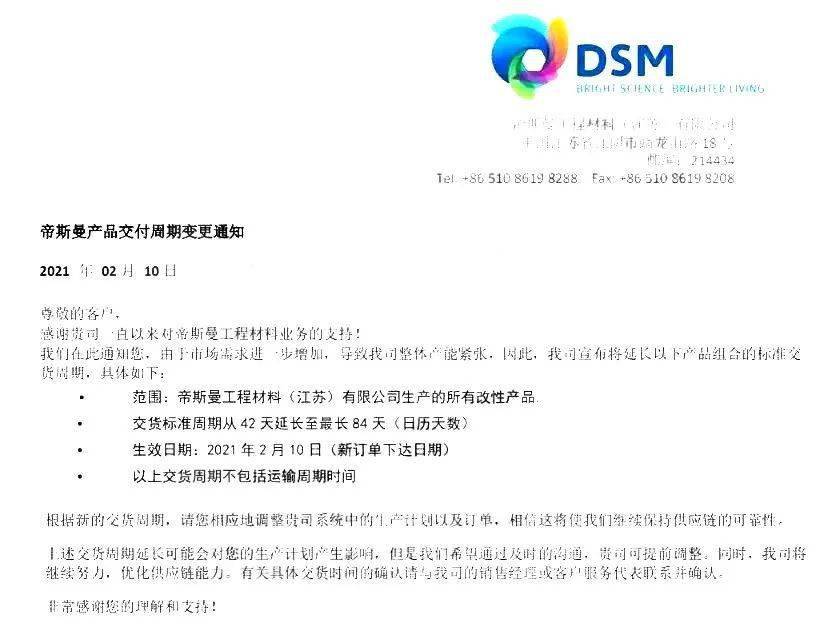 帝斯曼宣布由于产能紧张,自2月10日起, 延长交货期限为84天。