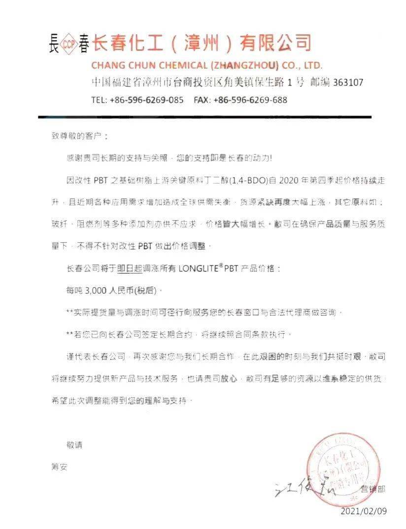 因 正丁醇价格暴涨,长春化工发布公告,上调所有 LONGLITE PBT产品价格, 每吨上调3000元。