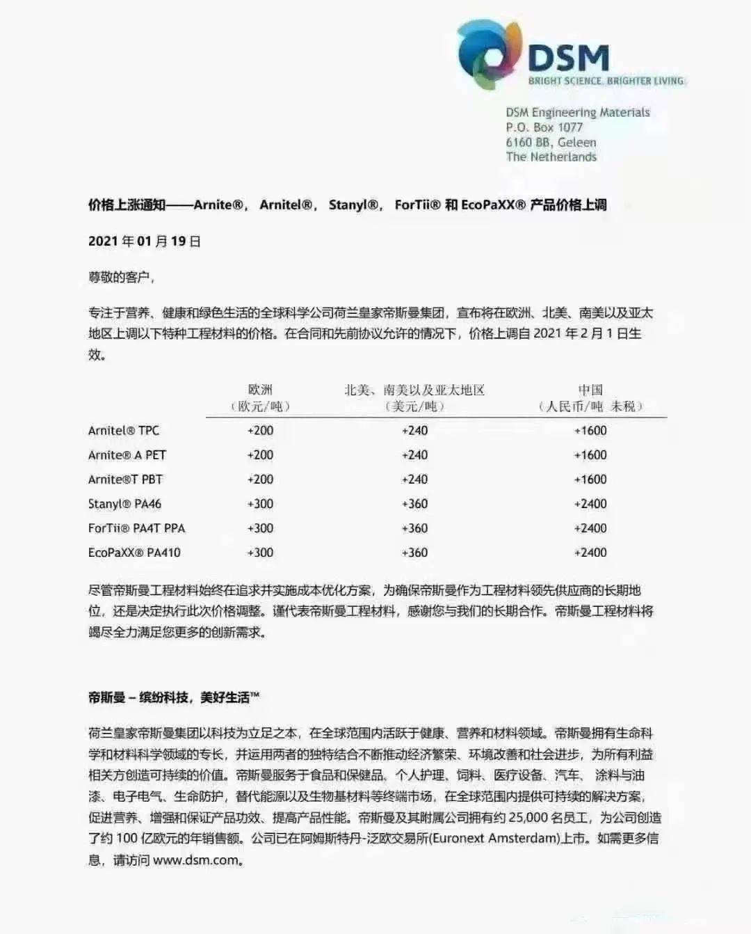 ▶▶▶帝斯曼:2月1日起,上调2400元/吨!