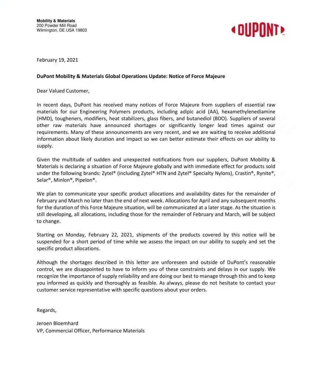 2月19日, 杜邦因原料供应商不可抗力缺货断供而宣布不可抗力,并宣布自 2021年2月22日(即今日)起,Zytel®(包括Zytel® HTN和Zytel®特种尼龙)、Crastin®、Rynite®、Selar®、Minlon®、Pipelon® 将暂停发货。
