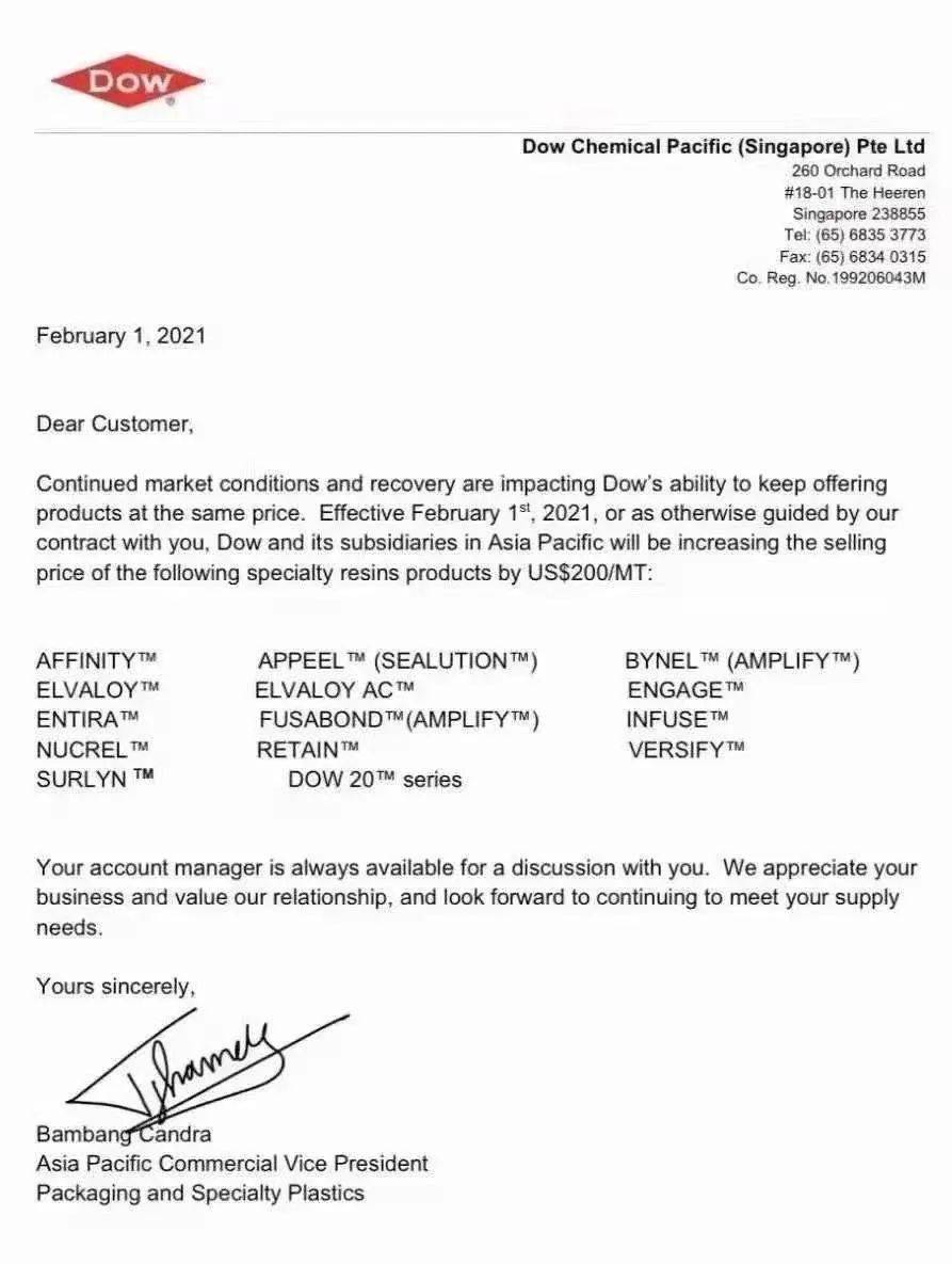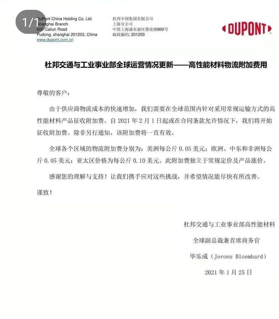 由于供应紧张,疫情导致运输难度增大,杜邦自2月1日起,全球运费上调,美洲、欧洲、中东、非洲 上调0.5美元/公斤,亚太地区 上调0.1美元/公斤。