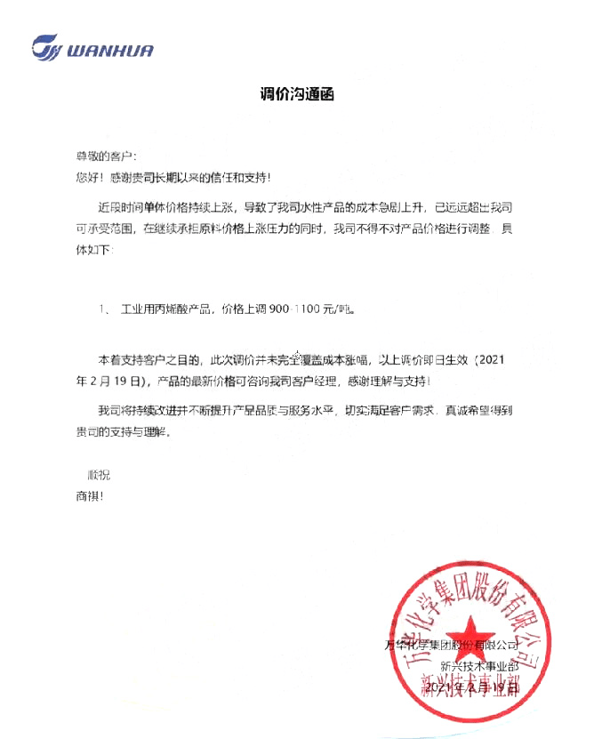 万华化学因成本上涨而上调 工业用丙烯酸价格。
