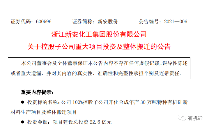 浙江新安22.6亿元投资有机硅