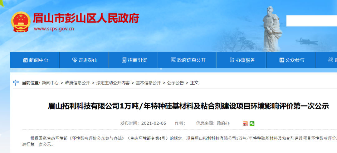 根据国家生态环境部《环境影响评价公众参与办法》(生态环境部令第4号)的规定,现将眉山拓利科技有限公司1万吨/年特种硅基材料及粘合剂建设项目环境影响评价工作情况进行第一次公示。