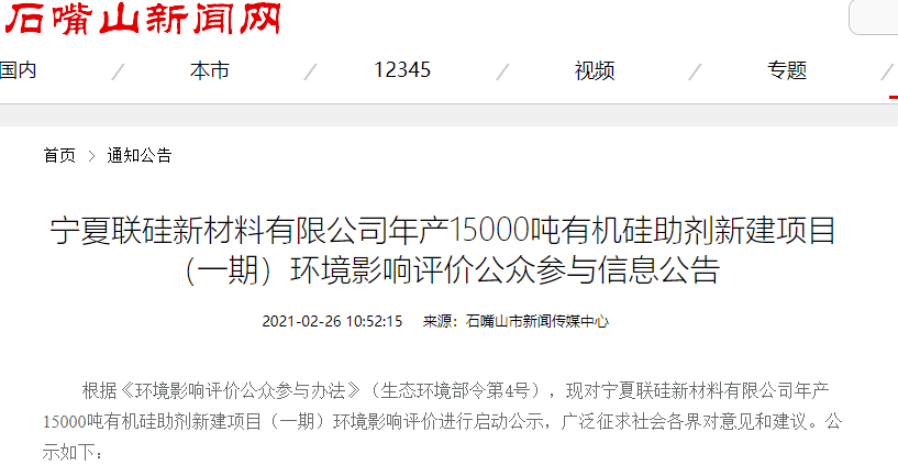 近日,石嘴山新闻网公示了宁夏联硅新材料有限公司(以下简称 宁夏联硅)年产15000吨有机硅助剂新建项目(一期)环境影响评价公众参与信息的公告。