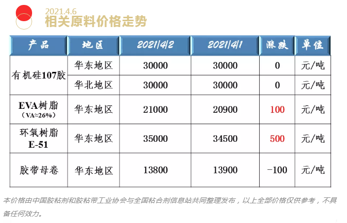 有机硅107、EVA树脂、环氧树脂和胶带母卷原料价格走势