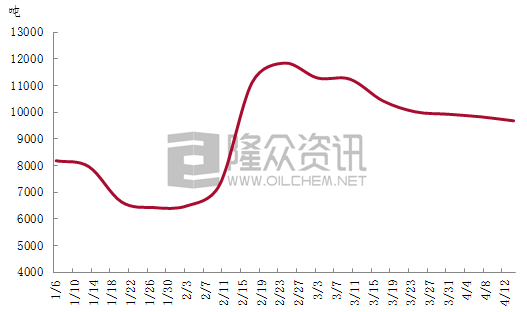 春节前后胶黏剂用C5石油树脂库存均处于低位,至节后备货结束,场内库存量出现明显上升,至3月下旬以后检修装置增多,场内库存量出现下滑,而整体水平仍在高位,下游按需采购以及1-3供货量增加,场内库存居高不下。