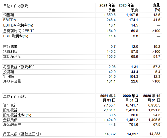 受上述因素的影响,集团息税前利润(EBIT)也有明显增加,在报告期实现的EBIT为1.549亿欧元,是上年同期(0.698亿欧元)的两倍还多,EBIT利润率为11.4%(2020年第一季度:5.8%)。瓦克在报告期实现净利润1.066亿欧元(2020年第一季度:0.689亿欧元)。报告期的每股收益为2.06欧元(2020年第一季度:1.31欧元)。