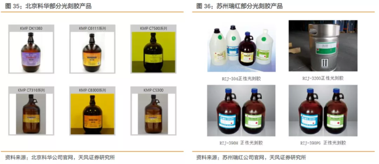 目前,国内g线、i线光刻胶的自给率约为20%,KrF光刻胶的自给率则不足5%,ArF光刻胶目前仍在研发测试中。根据SEMI数据,日本日本合成橡胶(JSR)、东京应化(TOK)和信越化学几大厂商在g线/i线、KrF、ArF胶市场中市占率分别达到了61%、80%、93%。