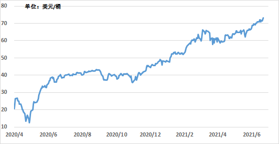 6月1日,布伦特原油期货价格两年以来首次收于70美元/桶上方,且继续维持涨势。截至6月22日,WTI原油报73.05美元/桶,维持在2018年10月以来新高。