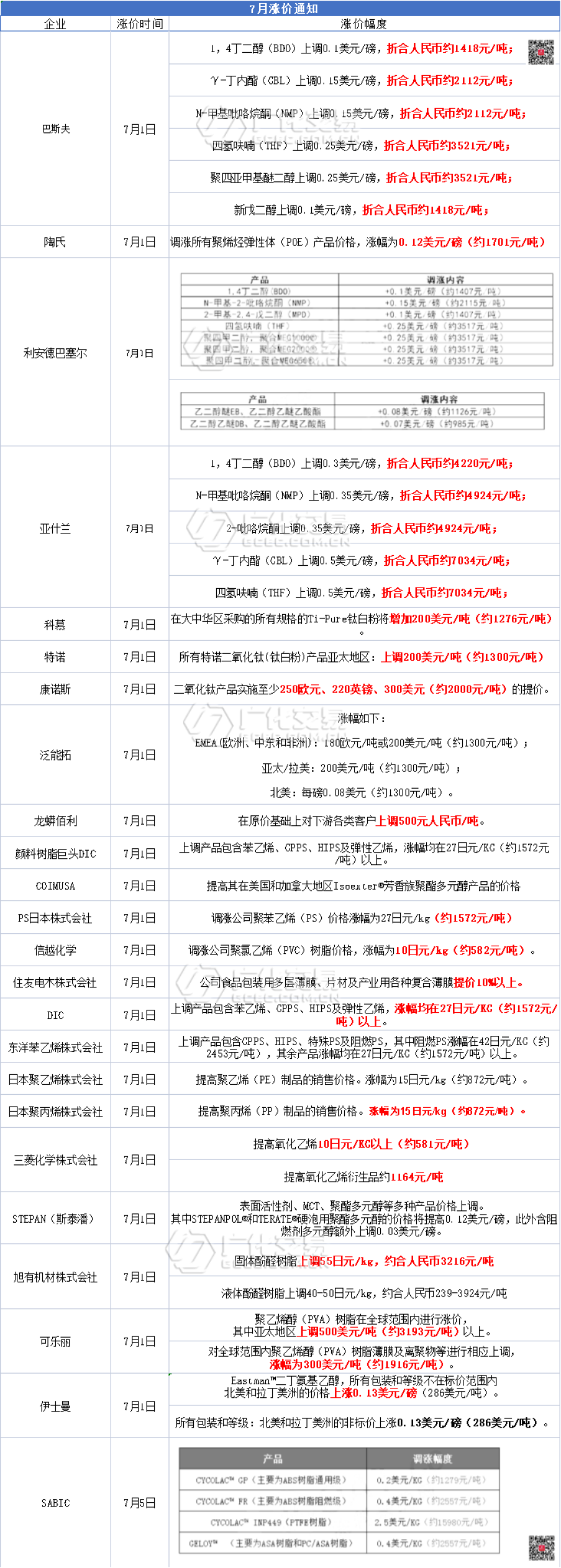 特诺宣布自7月1日起,对所有特诺二氧化钛(钛白粉)产品实行涨价。亚太地区:上调200美元/吨(约1300元/吨)。