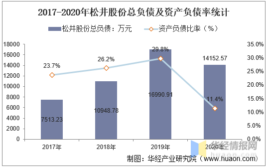 2020年松井股份总负债为14152.57万元,相比2019年减少了2838.34万元,同比下降16.71%。资产负债率11.39%。
