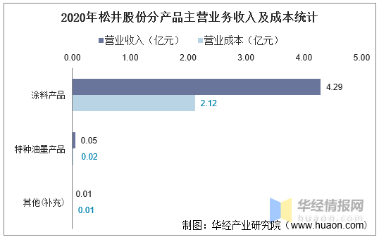 按产品分类来看,2020年松井股份主营业务总收入为4.35亿元,主营业务总成本为2.15亿元,其中:涂料产品实现营业收入为4.29亿元,营业成本为2.12亿元;特种油墨产品实现营业收入0.05亿元,营业成本为0.02亿元;其他(补充)实现营业收入为0.01亿元,营业成本为0.01亿元。