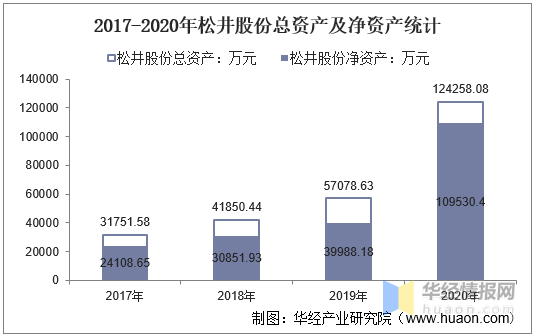 华经产业研究院数据显示:2020年松井股份总资产为124258.08万元,相比2019年增长了67179.45万元,同比增长117.7%;净资产为109530.4万元,相比2019年增长了69542.22万元,同比增长173.91%。