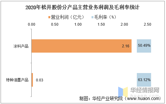按产品分类来看,2020年松井股份主营业务总利润为2.19亿元,其中:涂料产品实现营业利润为2.16亿元,毛利率为50.49%;特种油墨产品实现营业利润为0.03亿元,毛利率为63.12%。