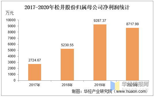 2020年松井股份归属母公司净利润为8717.99万元,相比2019年减少了569.38万元,同比下降6.13%。每股收益为1.26元。