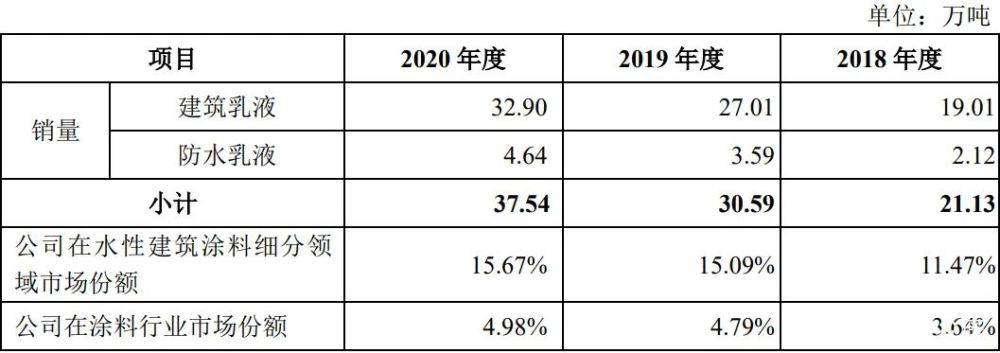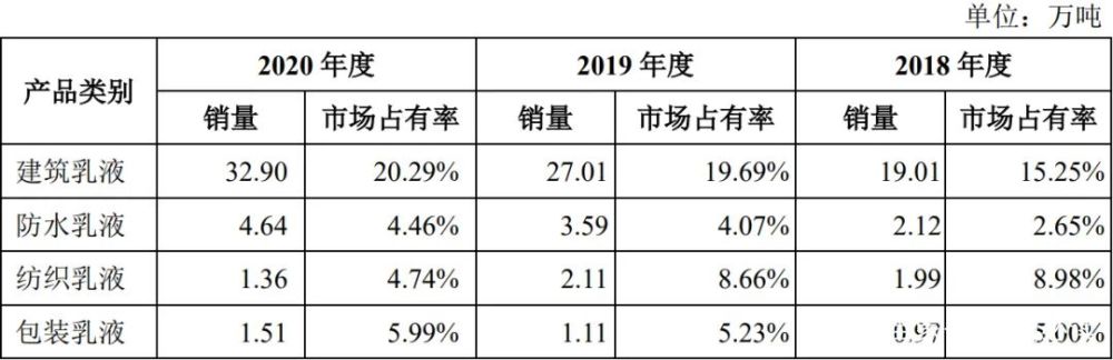 招股书显示,2020年保立佳产能为37.68万吨,销量为41.02万吨,在行业内位居前列。2019年产能为38.71万吨,产品销量为34.35万吨,其中水性丙烯酸乳液销量为33.82万吨。2019年保立佳所占市场份额为11.11%。