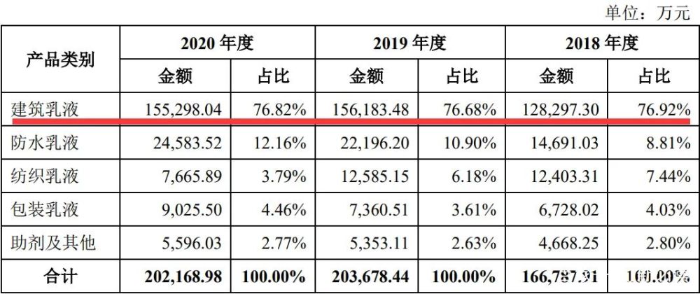 报告期内,公司建筑乳液产品收入分别为12.83亿元、15.62亿元和15.53亿元,占主营业务收入的比例分别为76.92%、76.68%和76.82%,是公司主营业务收入的主要来源。公司防水乳液产品收入分别为1.469亿元、2.220亿元和2.458亿元,占主营业务收入的比例分别为8.81%、10.90%和12.16%,占比保持稳定。