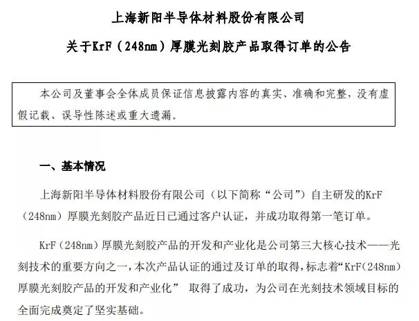还比如,6月30日,上海新阳发布公告称,公司自主研发的KrF(248nm)厚膜光刻胶产品近日已通过客户认证,并成功取得第一笔订单。