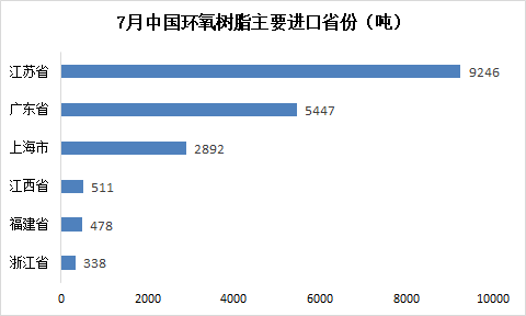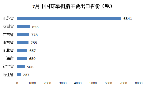 7月环氧树脂主要出口目的分布较为均匀,排在前几位的分别是阿联酋、泰国和荷兰等地;出口省份中江苏一省独大,占比在58%以上。