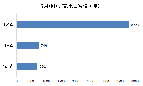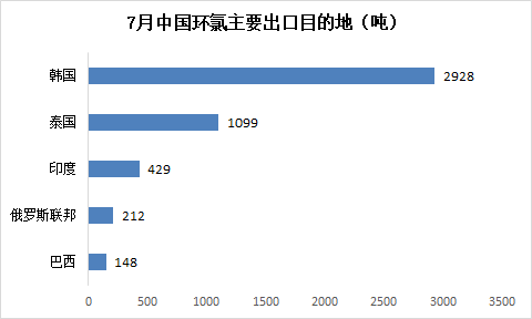 环氯出口目的地主要为韩国和泰国,其中韩国占7月总环氯总出口量的56%以上,主要出口省份是江苏,占7月全国出口量的72%以上。