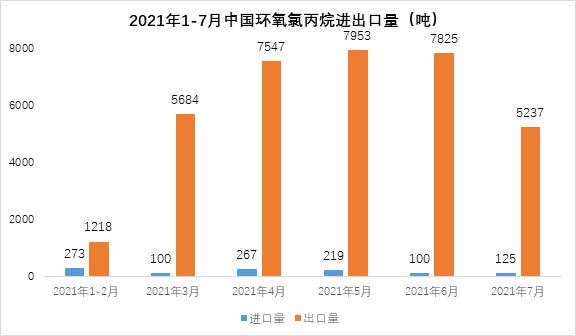 2021年7月份,中国环氧氯丙烷进口量为125吨,同比减少28%,进口均价美1687美元/吨;7月环氧氯丙烷出口量5237吨,去年同期出口量仅为100吨,出口均价2129美元/吨。