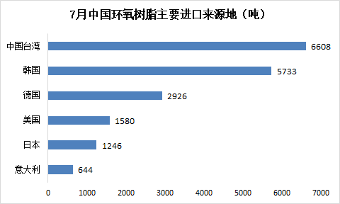7月环氧树脂主要进口自中国台湾和韩国,两地的总量合计占比在61%以上;主要进口的省份是华东的江苏、上海和华南的广东,三省进口量合计占比在88%以上。