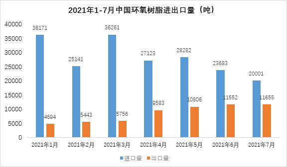 2021年7月份,中国环氧树脂进口量为20001吨,同比减少49.7%,环比减少15.5%;进口均价5174美元/吨,价格同比大幅增加74.6%;