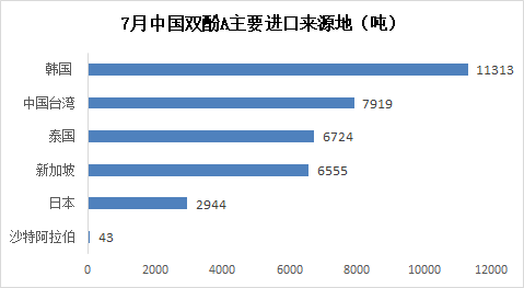 7月双酚A进口来源分布比较均匀,主要集中在韩国、中国台湾、新加坡和泰国四个地区。