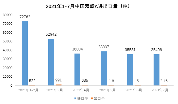 2021年7月份,中国双酚A进口量为35498吨万吨,同比减少47.8%,进口均价为2878美元/吨;出口量仅为2吨多,出口均价4538美元/吨(体量太小,价格不具参考性)。