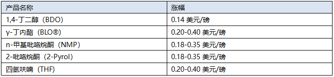 自2021年10月1日起或在合同云讯的情况下,亚什兰将提高北美地区1-4-丁二醇 (BDO) 和几种衍生产品的价格,如下所示: