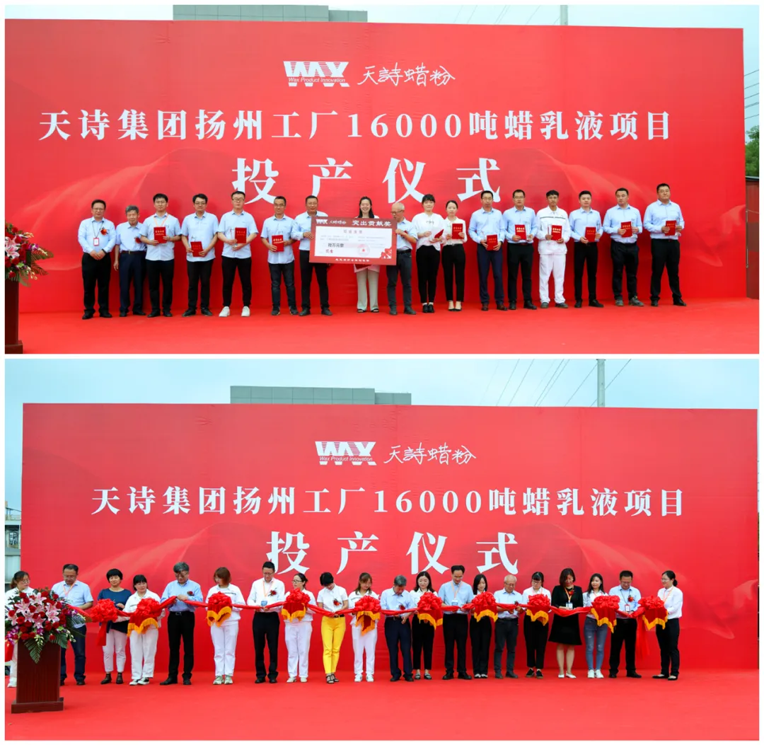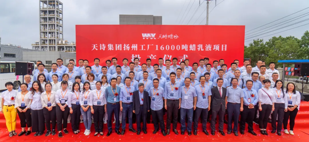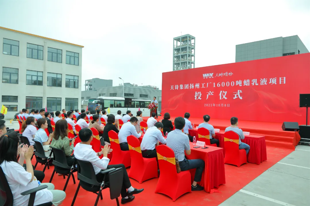 2021年10月8日下午,中国知名蜡助剂生产商——天诗集团16000吨蜡乳液项目投产仪式在扬州天诗工厂举行。仪征市领导、扬州化工园区和管理办领导,中海油常州化工涂料研究院及《涂料工业》领导,天诗集团创始人于天诗,天诗集团总裁于海阔,扬州天诗总经理阮世泽,集团全体领导班子成员出席了投产仪式。该项目标志着扬州天诗成为国内最大的聚乙烯蜡精制/氧化/乳化全产业链覆盖一体化工厂。