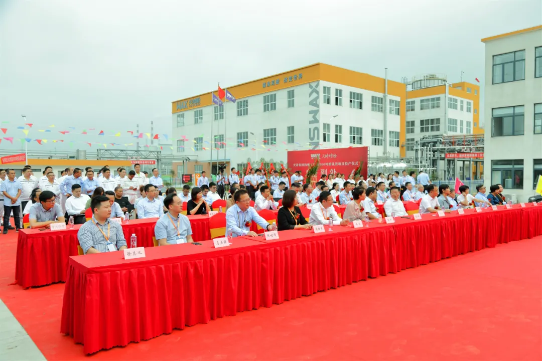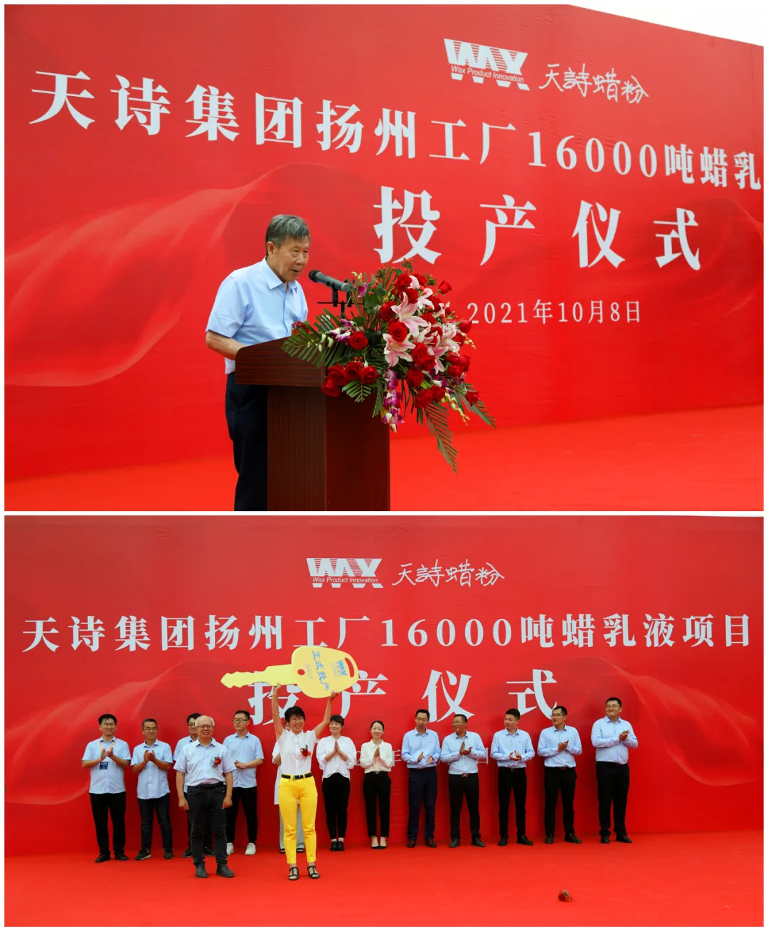 仪式上,扬州仪征市政协主席,中海油常州化工涂料研究院领导上台致词并表示祝贺。天诗集团创始人——86岁教授于天诗宣布蜡乳液项目正式投产。天诗集团对项目建设中做出突出贡献的团队成员进行了表彰。天诗蜡乳液运营团队接过象征着项目交付的金钥匙,并郑重宣誓:坚决保质保量的完成生产任务。