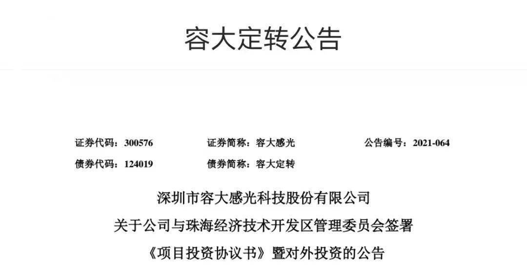 9月27日,深圳市容大感光科技股份有限公司(以下简称:容大感光)发布关于公司与珠海经济技术开发区管理委员会签署《项目投资协议书》暨对外投资的公告。