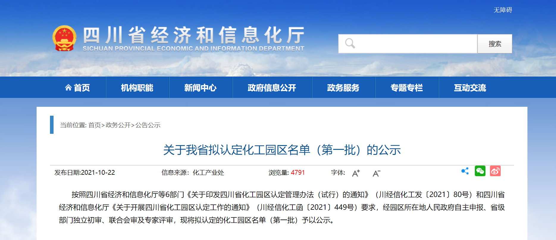 按照四川省经济和信息化厅等6部门《关于印发四川省化工园区认定管理办法(试行)的通知》(川经信化工发〔2021〕80号)和四川省经济和信息化厅《关于开展四川省化工园区认定工作的通知》(川经信化工函〔2021〕449号)要求,经园区所在地人民政府自主申报、省级部门独立初审、联合会审及专家评审,现将拟认定的化工园区名单(第一批)予以公示。