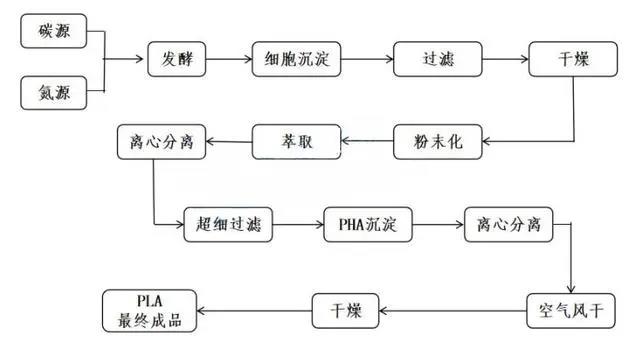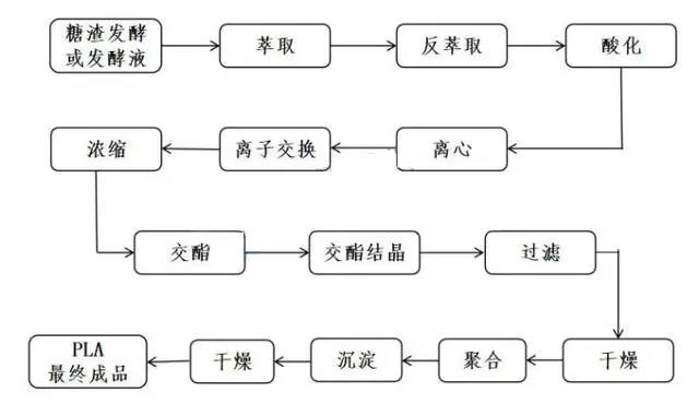 PLA是以乳酸为主要原料聚合得到的聚合物。目前聚乳酸的生产主要通过对玉米、薯类、甜菜等农作物进行深加工,得到塘渣,经过发酵、萃取、离心、离子交换、浓缩等工艺生成交酯,然后通过开环聚合工艺将交酯脱水生成低聚合物,最后经过干燥、沉淀等工序制得聚乳酸。