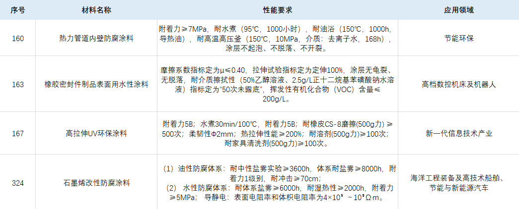 根据目录显示,热力管道内壁防腐涂料、橡胶密封件制品表面用水性涂料、高拉伸UV环保涂料、石墨烯改性防腐涂料等高端涂料皆被列入《重点新材料首批次应用示范指导目录(2021年版)》内。