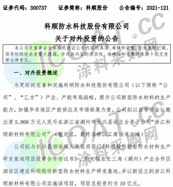 近日,科顺股份发布投资公告,拟与长兴县泗安镇人民政府签订投资合作协议书,将在长三角(湖州)产业合作区泗安区建设科顺股份新型防水材料生产研发基地,并以自有资金认缴出资5000万元在浙江省湖州市长兴县设立全资子公司“浙江科顺新材料有限公司”作为该项目实施主体,项目总投资金额约为10亿元。