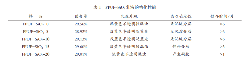 乳液离心稳定性的测试:常温下测试FPUFSiO2乳液稳定性。将乳液装入离心管高速离心,观察乳液外观,若未发现沉降则可认为聚氨酯乳液具有6个月以上的稳定期。参数设定:转速为3000r/min,时间为15min。