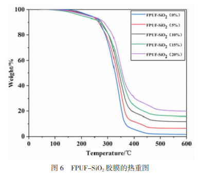 热重分析(TGA):FPUF-SiO2乳胶膜在升温范围0℃~600℃、升温速率10℃/min的条件下测试。