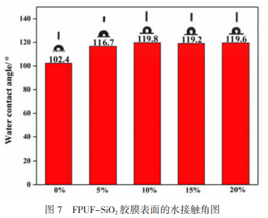 (2)随硅溶胶的用量增加,FPUF-SiO2胶膜的疏水性先增加而后略减小,FPUF-SiO2-10胶膜的疏水性最好,静态接触角为119.8°,吸水率为2.49%。