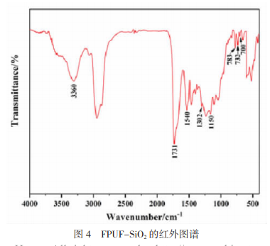 FPUF-SiO2红外图谱如图4所示。图中3360cm-1处和1540cm-1处分别为N—H的伸缩振动峰和弯曲振动峰,1731cm-1处为C=O的伸缩振动峰,在1302cm-1处的出峰为C—N的弯曲振动,证实了酰胺键的存在。而在1150cm-1处出峰为C—O—C的不对称伸缩振动峰。因引入了氟烷基和硅烷氧基改性WPU,可知783cm-1处的出峰归属于Si—C键弯曲振动,732cm-1及700cm-1处的吸收峰归属于C—F键的弯曲振动,表明DEFA、DESiA与PU成功反应。综上所述,DESiA、FPUF-SiO2均具有预期的结构。