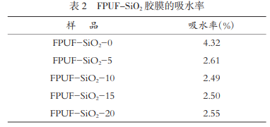 吸水率:将FPUF-SiO2胶膜裁成1cm×1cm,称初始质量(W1),室温下蒸馏水中浸泡48h后再次称重(W2)。吸水率Q(%)=(W2-W1)/W1。