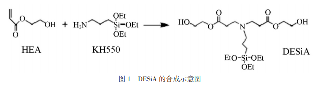 首先制备含氟和含硅扩链剂,其中含氟扩链剂的制备方法参见文献。γ-氨丙基三乙氧基硅烷(KH550)与丙烯酸羟乙酯(HEA)的物质的量比为1∶2.1,阻聚剂4-甲氧基苯酚的质量分数为5‰。在冰水浴内装有搅拌器、冷凝装置和滴液漏斗的三口烧瓶中,注入KH550和4-甲氧基酚的混合液,再缓慢滴入HEA,反应0.5h。然后将体系升温至40℃,继续反应6h后得到DESiA粗产物。经去离子水多次萃取,除去未反应的单体后于50℃和-0.1MPa条件下旋蒸除去水与溶剂,制得小分子含硅扩链剂(DESiA),其制备反应过程如图1所示。