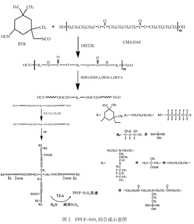 将一定量的IPDI和CMA-1044加入装有温度计、搅拌器和冷凝回流装置的三口烧瓶中,升温至80℃后加入3滴DBTDL搅拌反应1h。然后加入计量的DMPA、BDO、DEFA和DESiA扩链,同时添加适量丙酮以控制黏度,反应2.5h。再将S104与适量丙酮混合后缓慢滴入反应体系,反应3h。取一定量的PE溶于适量的NMP,缓慢滴加至反应体系,反应1h。最后将反应体系降温至40℃,加TEA中和反应0.5h,在高速搅拌下0.5h内滴加去离子水与水性硅溶胶混合液进行乳化,将制备的乳液减压蒸馏除去有机溶剂,控制水性硅溶胶的用量可制得端/侧氟烷基共改性聚氨酯杂化乳液(FPUF-SiO2-x,x=0,5,10,15或20,表示引入的水性硅溶胶的用量分别为0,5%,10%,15%和20%)。其反应过程方程式如图2所示。