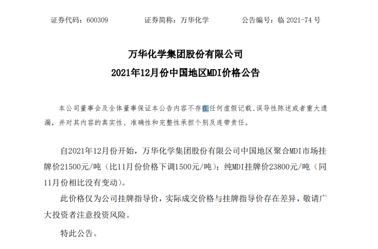 11月26日晚间,万华化学发布公告,自2021年12月份开始,公司中国地区聚合MDI市场挂牌价21500元/吨,比11月份价格下调1500元/吨;纯MDI挂牌价23800元/吨,同11月份相比没有变动。
